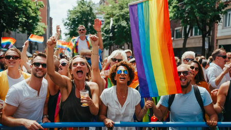 Happy people at a pride parade celebrating diversity