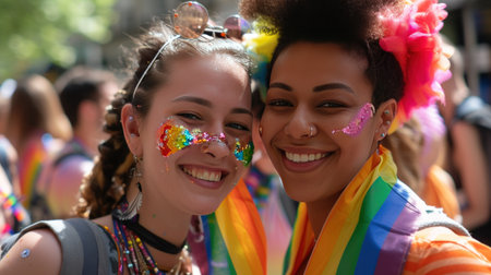 Two joyful women with colorful makeup and attire at a Pride parade, celebrating LGBTQ+ diversity and unity.