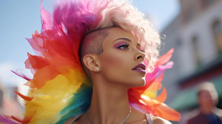 Close-up. A happy African-American transvestite. A woman and a man in a rainbow afro clown wig and shiny makeup celebrate LGBT+ at the pride parade. Gay in fancy dress.