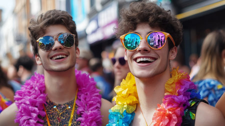 Two individuals dressed in vibrant rainbow-themed outfits and makeup smiling during a pride parade. The lively urban street is filled with people waving rainbow flags, celebrating diversity and inclusion.