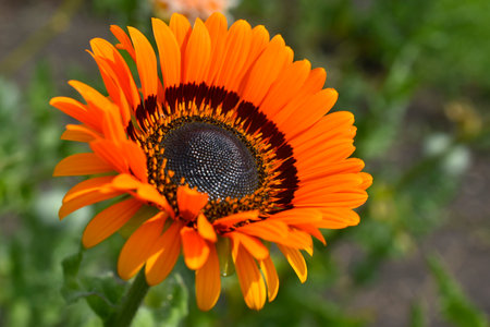 A closeup shot of an orange daisy flower blooming in a garden against a dark background