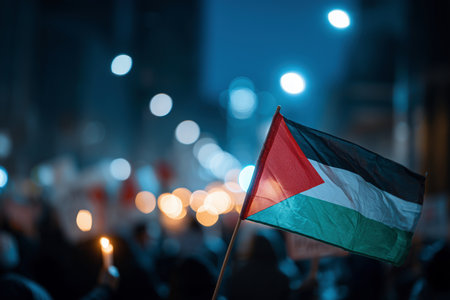 Palestine flag waving gently in the wind, peaceful protest atmosphere, soft lighting, people in the background holding candles and signs of peace, unity AI Generated