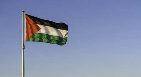 Palestine flag with its distinctive red triangular chevron and horizontal stripes of black, white, and green, waving on a flagpole against a clear blue sky. represents national identity, independence, and heritage.