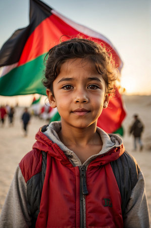 Portrait of a Child Looking in Distance With a Palestinian Flag Background