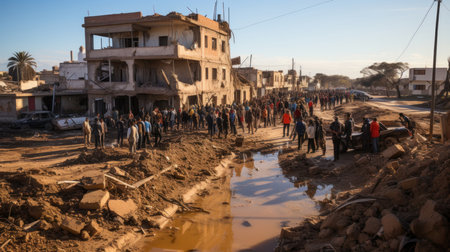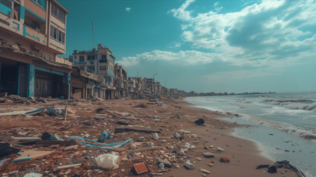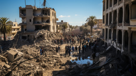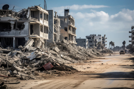 A photograph depicting a street completely covered in rubble and debris, Destroyed buildings in Gaza town of Gaza strip in Israel, AI Generated