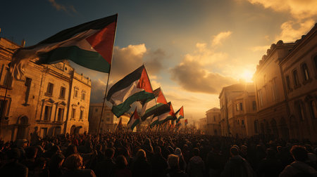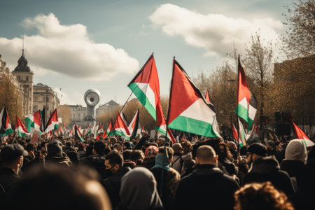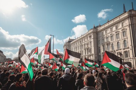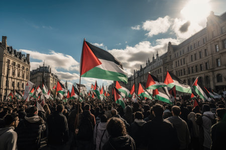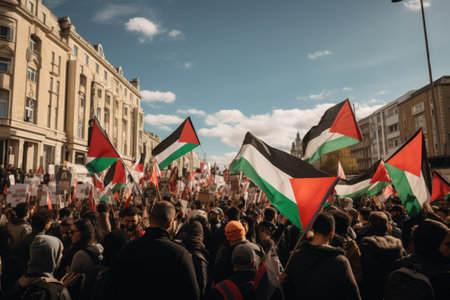 Thousands of people with palestine flags rallying in the street a crowd waving flags during protest