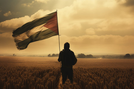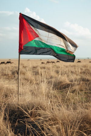 Palestinian flag stands tall in the center of a desolate, dry field, symbolizing hope and resistance in challenging times.