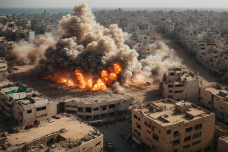Conflict between Israel and Palestine concept. Burning and destroyed city by war. Concept of crisis of war creative decoration. Selective focus