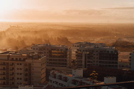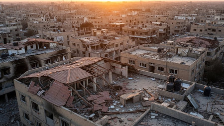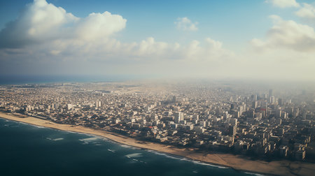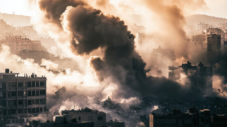 Hazy showing aerial view of a vast urban landscape devastated by destruction with piles of rubble and damaged buildings under a hazy sky and soft sunlight creating...