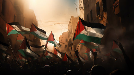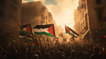 Palestinian Freedom Protest. Conflict and war concept. Palestine vs Israel. People of Palestine raising Flags in the city Copy space Space for text