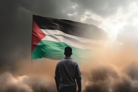 Man looking at the flag of Palestine waving in the wind against cloudy sky