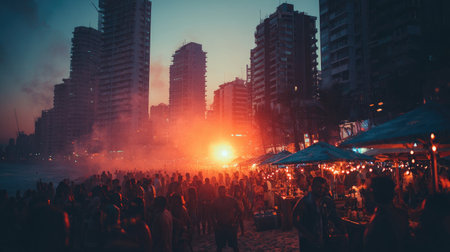 A lively outdoor concert with a large crowd silhouetted against a colorful sunset and city skyline.