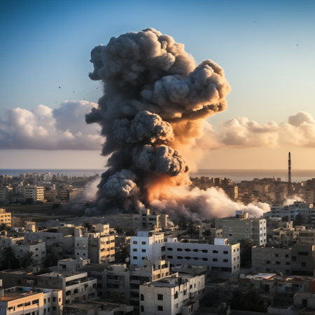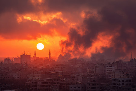 Smoke plumes rising above Gaza city skyline during sunset, illustrating the devastating impact of war and conflict