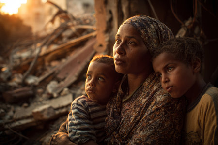 Mother embraces her two children, providing comfort and safety amidst the destruction of their war-torn city at sunset