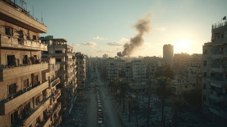 An aerial view shows a city scene with damaged buildings and a column of dark smoke against a cloudy sky. The composition features rows of buildings, suggesting an urban setting during the day. The scene evokes a sense of destruction and unrest. Suitable for editorial and commercial applications related to conflict.