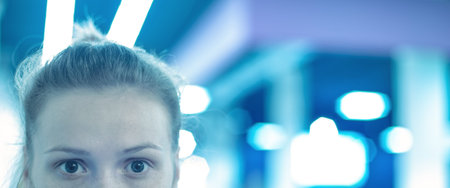Close up of a beautiful blue eye female gaze on red light