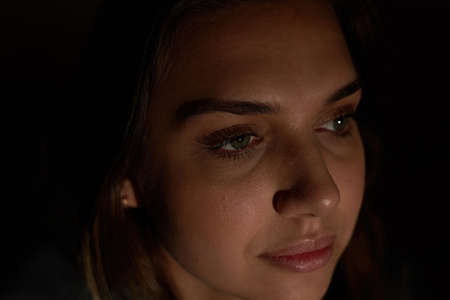 Facial portrait of a young beautiful girl with long dark hair. Low key woman portrait