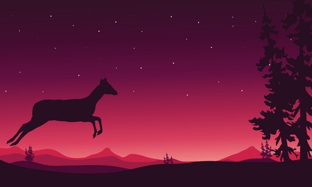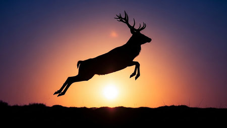 A stag is captured mid-leap in silhouette against a colorful sunset sky. Clear details and vibrant colors enha...
