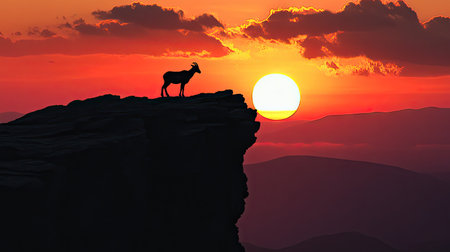 A lone goat stands silhouetted against a vibrant orange sunrise, set against rolling mountains. This serene landscape captures the beauty of nature and tranquility.