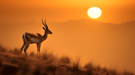 A stunning silhouette of an antelope stands gracefully against a golden sunset in a vast grassland, capturing the essence of wild beauty and tranquility.