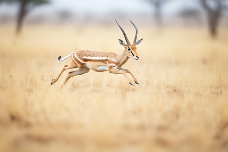 A gazelle is running through a field of tall grass. Concept of freedom and wildness, as the gazelle leaps through the open space