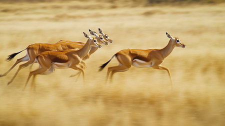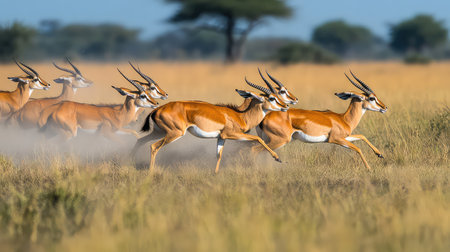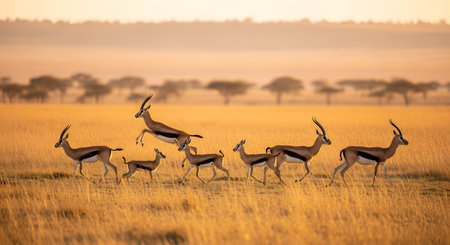 A stunning view of a herd of gazelles in motion across the vast golden grassland of the African savanna. The scene captures the beauty and grace of wildlife in its natural habitat.