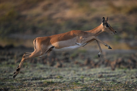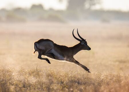 Antelope jumping. Very dynamic shot. Botswana. Okavango Delta. An excellent illustration.