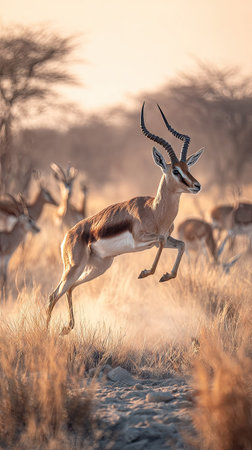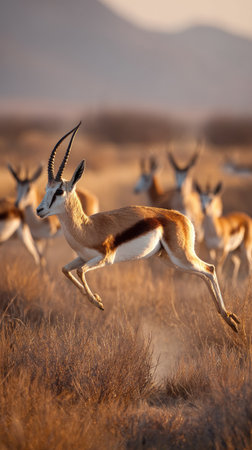 A group of springbok antelopes are captured in motion, with one prominently leaping forward. The scene displays warm, earthy tones with the animals' brown and white coats contrasting against the golden grasses and the soft, diffused light of a day. This image could be suitable for wildlife publications or environmental projects.