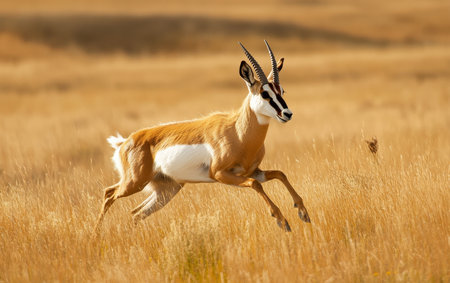 Elegant gazelle gallops through a golden field with a warm, soft-focus background