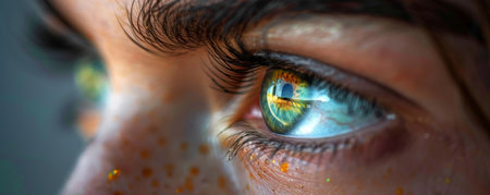 A close up of a womans eye with freckles and green eyes, AI