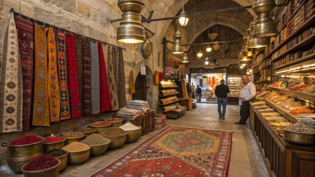 Baku, Azerbaijan - May 4 2024: An open doorway reveals a shop in the historic Icherisheher district of Baku, showcasing colorful woven rugs, bags, and other traditional goods for sale