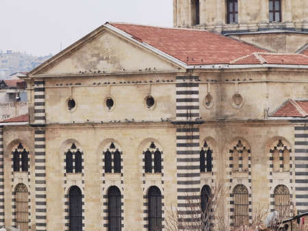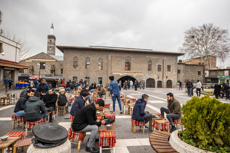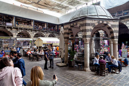 Diyarbakir - Turkey - 05-02-2019: View of the Hasan Pasa Khan. The Hasan Pasa Khan is historic building whre people have breakfast and small shops.