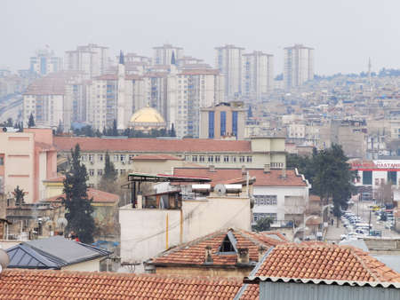 Ankara, Turkey - July 24, 2018: View above of Ankara houses with tiled roofs and skyscrapers in summer cloudy day