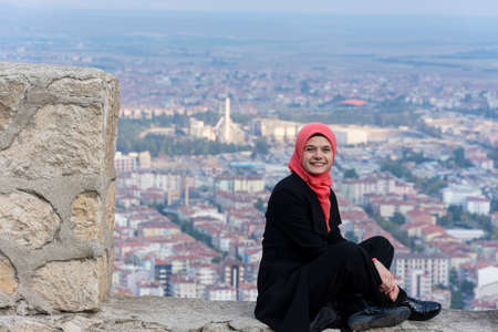 Happy female tourist sitting on the ruins of the Afyon castle. Ancient Afyonkarahisar city in the background. Turkey tourism, famous destination, traditional town