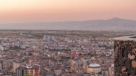 Aerial view from old castlethe in historical city town of Nevsehir timelapse. Panoramic skyline with buildngs covered by warm sunset light