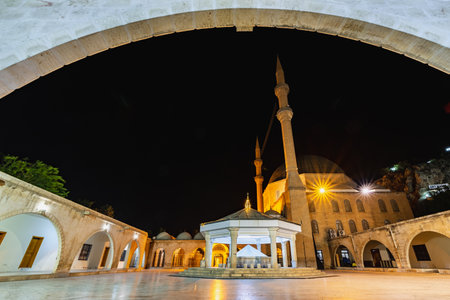 View of ablutions fountain and Mevlidi Halil Mosque in Sanliurfa,Turkey.18 July 2018