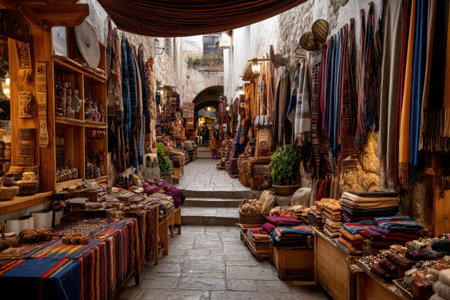 A bustling market street features vibrant stalls filled with textiles and handmade crafts. Visitors browse the colorful goods in a charming, historic neighborhood.