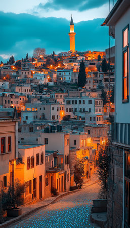 Enchanting Evening in Goreme Traditional Turkish Architecture with Iconic Minaret at Sunset.