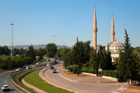 Antalya, Turkey - June 20, 2022: Building of Koy Hizmetleri Mosque and Dumlupinar boulevard in central Antalya