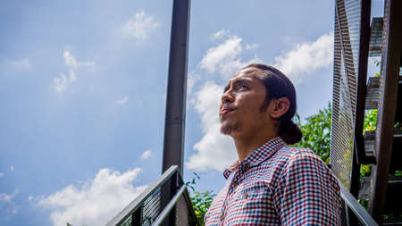 A portrait of handsome young Asian man standing on the staircase smiling and wearing a casual long sleeve shirt with urban modern architectural as background. Businessman looking to camera concept.