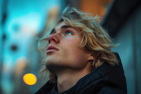 Pensive male model with flowing blonde hair against a backdrop of city lights at dusk