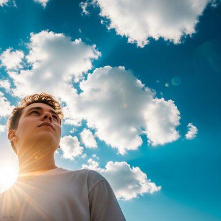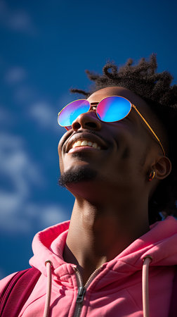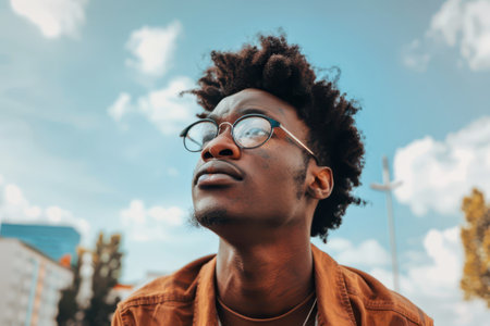 A young man gazes upward, his reflective glasses capturing the sunlight and the beautiful clouds above him. He stands amidst a city backdrop, showcasing urban life and nature