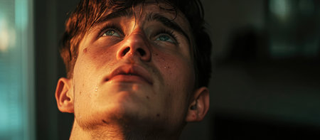 Touched by His Grace. Close-up of a beautiful young man looking up with tears in her eyes. Christian concept