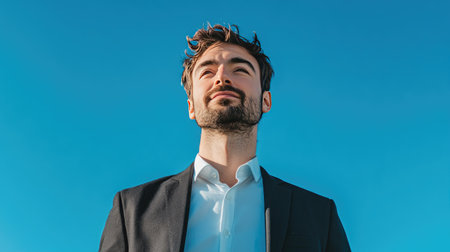 A modern architectural design featuring clean lines against a clear blue sky, with a man dressed formally exuding confidence and professionalism.