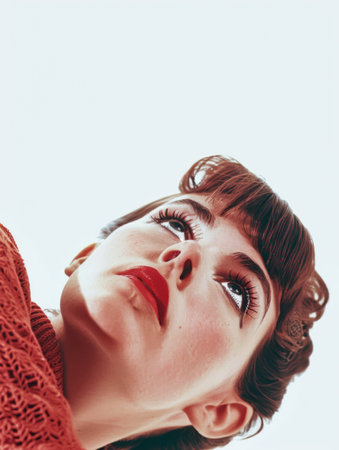 Young woman with curly hair gazing thoughtfully upward against a gray background in a contemplative moment