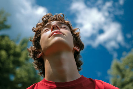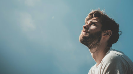 Serene male enjoying fresh air outdoors, basking in sunlight and embracing vitality and tranquility