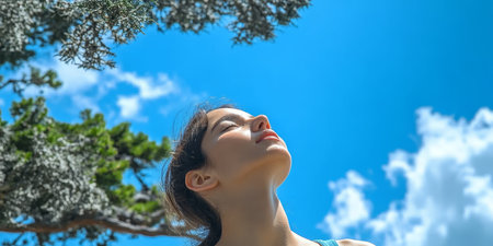 Enjoying a Moment of Tranquility in Nature A Woman Embracing Fresh Air and Outdoor Beauty