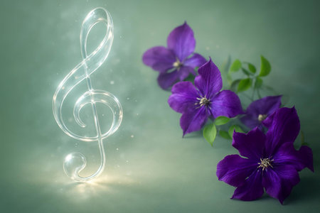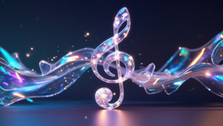 A luminous, glass-like green treble clef stands out against a shimmering teal bokeh backdrop, evoking harmony and artistic inspiration.