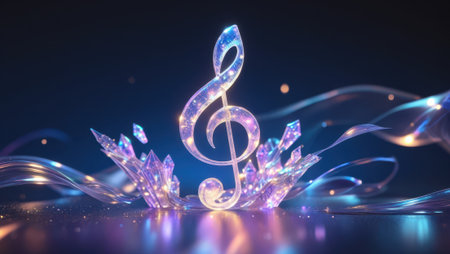 Glowing treble clef symbol illuminated with vibrant purple and blue hues, surrounded by crystal-like shards and flowing light ribbons on a dark background.