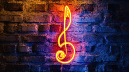 A striking neon musical note illuminated against a textured brick wall, creating a vibrant and dynamic atmosphere perfect for music-themed projects and designs.
